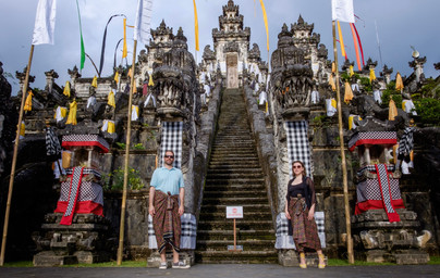 Was viele jedoch nicht wissen: das Gate ist nur ein Teil der Tempelanlage Pura Penataran Agung Lempuyang, die auf 600m Höhe auf dem Berg Lempuyang erbaut wurde und einer der sechs wichtigsten Tempel des Hinduismus auf der Insel ist. Die Anreise zum Gate of Heaven ist eine kleinere Herausforderung: das Auto muss unten am Berg geparkt werden, von dort aus geht es mit einem öffentlichen Shuttle weiter. Dieses bringt einen bis beinahe zum Eingang des Tempels, aber eben nicht ganz. Die letzten Paar Hundert Meter bergauf müssen zu Fuß erstiegen werden (oder man kann ein Moped-Shuttle mieten). Achtet bei der Wahl eurer Schuhe hierauf. Das Allheiligste, der Innenbereich des Tempels selber darf, wie fast überall, nicht betreten werden. Selbst für die äußeren Bereiche der Tempelanlage mussten wir Sarongs tragen (diese gibt es am Eingang kostenfrei auszuleihen, drei verschiedene Farben stehen zur Wahl) und wenn die Schlutern nicht mit Kleidung bedeckt sind (ich trug Spaghettiträger), bekommt man zusätzlich ein Schultertuch. Bei Bezahlung des Eintrittsgeldes in Höhe von IDR 100'000 pro Person erhält man außerdem einen Zettel mit einer Nummer - dies ist eure Stelle in der Schlange. Denn wer dachte, dass man 'einfach so' zum Gate kommt um Fotos zu machen, hat sich geirrt. Es heißt warten, bis man dran ist.